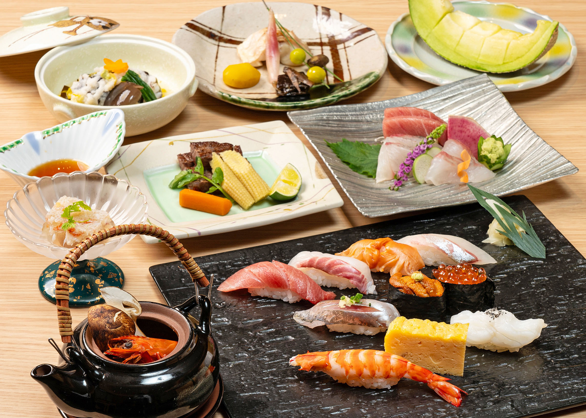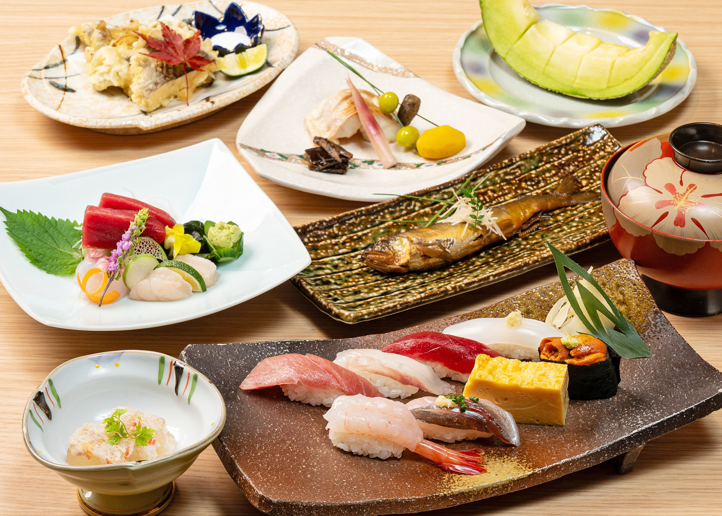 お通し、お造り、季節の料理三品、寿司十貫、巻物、お椀、水菓子