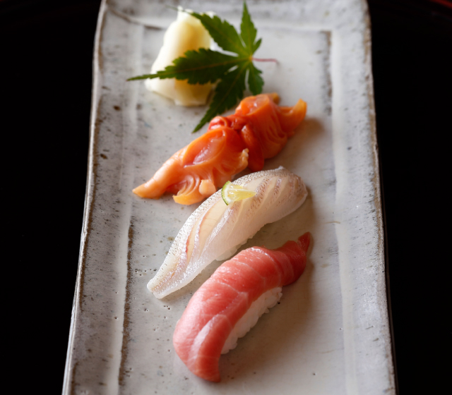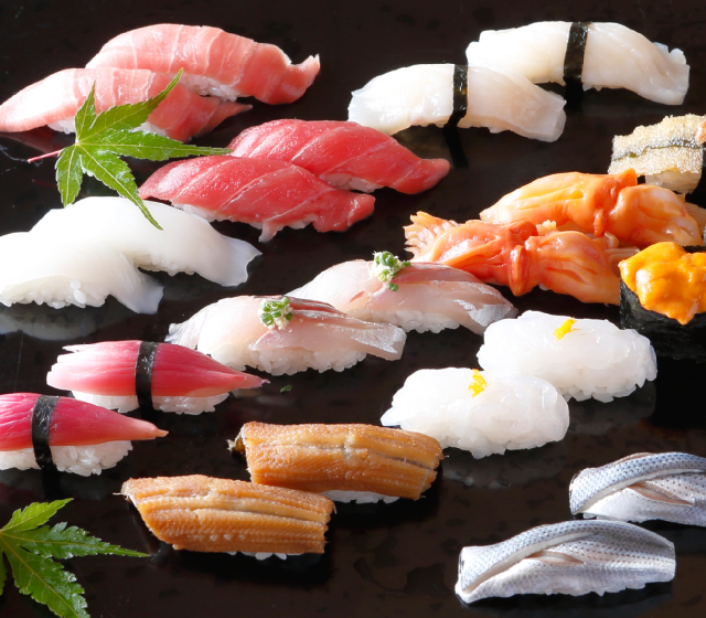 お通し、お造り、季節の料理三品、寿司十貫、巻物、お椀、水菓子